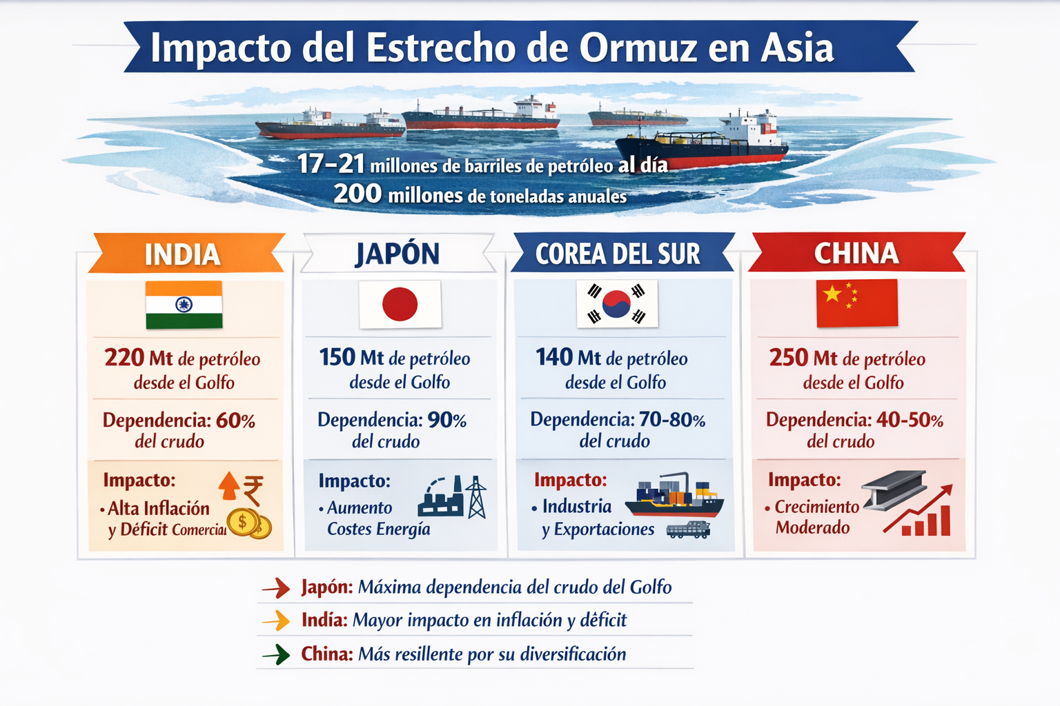 En Japón la exposición física al Estrecho de Ormuz es incluso mayor. Aproximadamente el 90% del petróleo que importa procede del Golfo Pérsico y atraviesa este corredor marítimo, lo que sitúa el volumen total en el entorno de los 150 millones de toneladas anuales directamente vinculadas al estrecho. Sin embargo, el impacto macroeconómico presenta matices distintos. La economía japonesa, caracterizada por una elevada eficiencia energética y una larga experiencia en la gestión de shocks externos, absorbe parte del impacto a través de mecanismos institucionales y financieros. Aun así, el encarecimiento del crudo se traslada a sectores clave como la generación eléctrica —especialmente relevante tras la reducción del peso de la energía nuclear— y la industria pesada. El resultado es un aumento de costes que presiona los márgenes empresariales y, en menor medida, una inflación que, aunque más contenida que en otras economías, refleja igualmente la dependencia estructural del suministro externo.