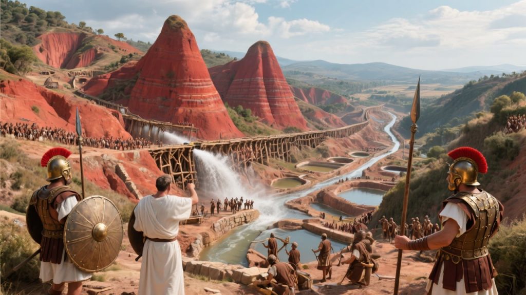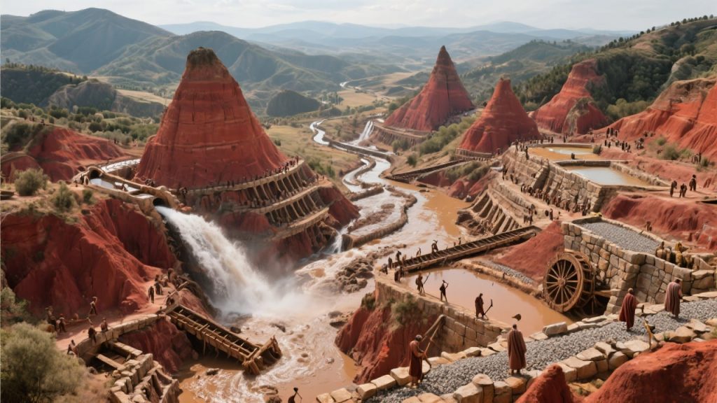 En Las Médulas trabajaron entre 2.500-5.000 personas, removiendo 90 millones de m³ de material para extraer casi 5 toneladas de oro. El agua era esencial: se construyeron canales, estanques y túneles como los «Montes Furados» para desviar ríos y explotar arenas auríferas.