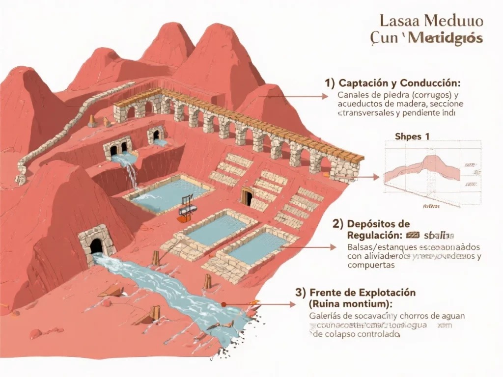 El método de explotación en las Médulas utilizado por Roma es conocido como ruina montium. Consistía en canalizar agua desde cotas elevadas mediante una extensa red de canales, embalsándola y liberándola de golpe para provocar el derrumbe controlado de las montañas y arrastrar el mineral aurífero hacia las zonas de lavado.
