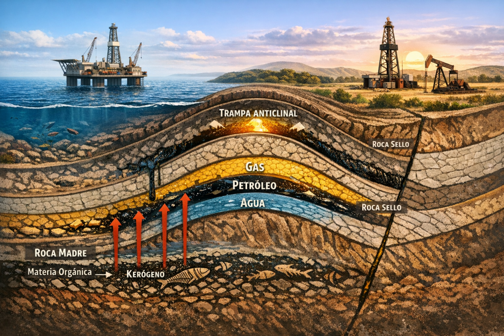En el imaginario colectivo, un yacimiento de petróleo suele percibirse como una especie de “bolsa subterránea” repleta de hidrocarburos lista para ser extraída. Sin embargo, la realidad geológica es mucho más compleja. La existencia de un yacimiento petrolífero es el resultado de una secuencia de procesos naturales que se desarrollan durante millones de años y que requieren una combinación extremadamente precisa de condiciones físicas, químicas y estructurales. Este conjunto de elementos interrelacionados es lo que los geólogos denominan un sistema petrolero.