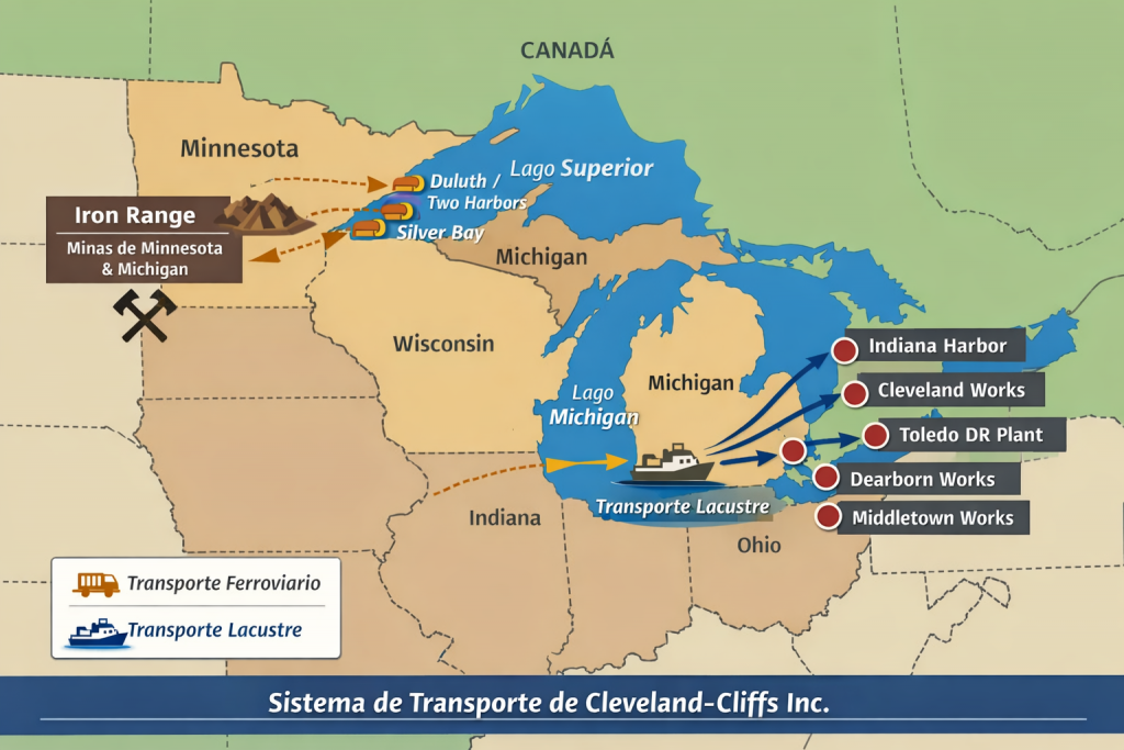 El sistema de transporte de Cleveland-Cliffs Inc. constituye uno de los elementos clave de su modelo industrial y una de las principales razones de su competitividad dentro del sector del hierro en Norteamérica. A diferencia de los grandes productores globales, cuyo negocio se articula en torno a la exportación transoceánica, la compañía ha desarrollado una red logística integrada, regional y altamente eficiente, diseñada para abastecer de forma directa a la industria siderúrgica del Medio Oeste de Estados Unidos.